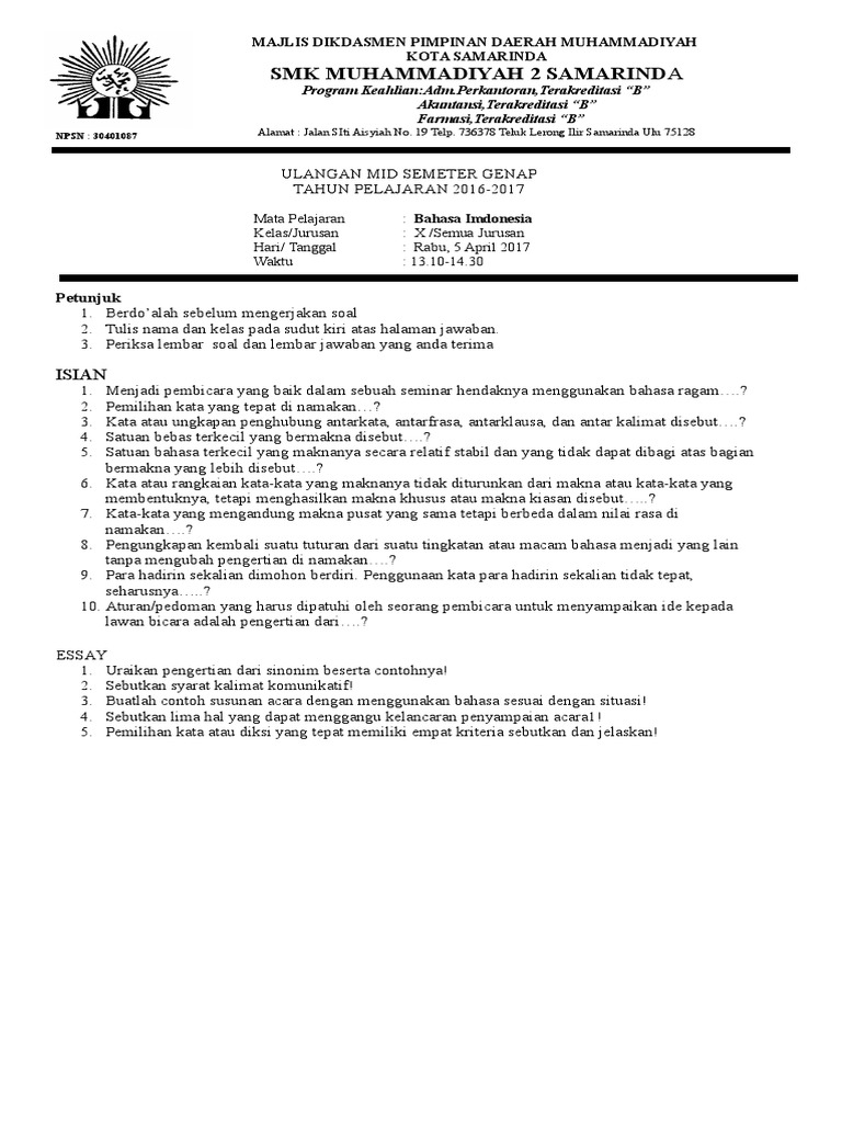 Download bank contoh soal bahasa indonesia kelas 10 semester 1 dan semester 2 kurikulum 2013 soal eassy pilihan ganda & kunci jawabannya. Soal uts bahasa indonesia kelas 3 semester 1 tahun ajaran 2018/2019 adalah konten. Soal bahasa indonesia kelas 10 beserta kunci jawaban ini admin bagikan secara gratis dalam format pdf dan doc bisa digunakan untuk penilaian. Soal sudah dilengkapi dengan kunci jawaban.