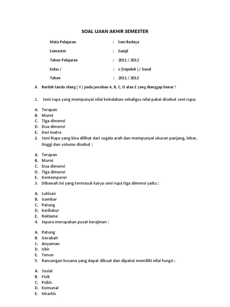 20 Contoh Soal Uas Seni Budaya Kelas 9 Smp Mts Semester Genap Docx from imgv2-1-f.scribdassets.com Benda seni rupa teparan sering disebut … a. Bila butir soal sebelumnya berbentuk pilihan ganda, maka untuk postingan ketiga ini berbentuk essay/uraian. Seni yang merupakan seni a.