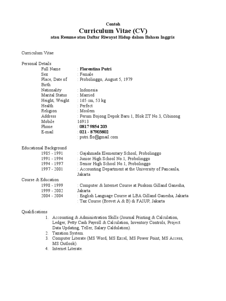 Format Serta Contoh Curriuclum Vitae Yang Baik Dan Benar Dalam Bahasa Inggris Bukuinggris Co Id from www.bahasainggris.co.id Cv (curriculum vitae) atau daftar riwayat hidup merupakan salah satu dokumen penting yang wajib dilampirkan, ketika kamu melamar pekerjaan. Contoh cv dan surat lamaran kerja dalam bahasa inggris curriculum vitae curriculum vitae. Selain peribahasa mengandung pilihan bahasa yang indah, peribahasa adalah juga mengandung pelajaran tertentu.